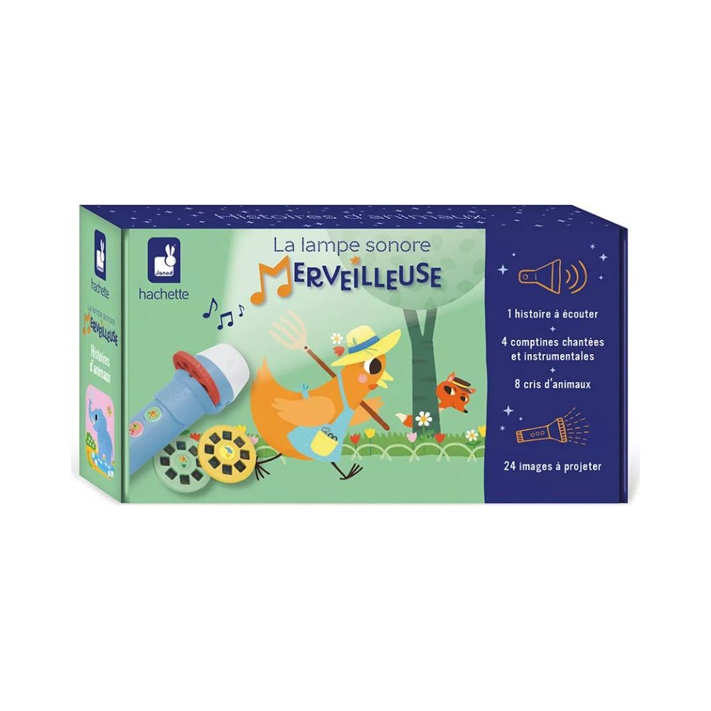 Envolez-vous pour la ferme ou la savane avec la Lampe Sonore Merveilleuse « Les Animaux », la lampe à histoires idéale pour les enfants dès 3 ans. Protagonistes incontournables des fables ou des comptines, nos amis les animaux sont à l’honneur ! Invitez votre bambin dans un univers magique et donnez vie aux récits avec cette chouette conteuse d’histoires ! Cette lampe rigolote est bien plus qu'une simple lampe de poche pour enfant. En effet, elle combine un projecteur d'images et une conteuse sonore, créant ainsi une expérience immersive pour les tout-petits. 9 minutes de son sont disponibles pour cela : une douce histoire de 4,5 minutes intitulée « La petite poule rousse », 4 comptines accompagnées de leurs versions instrumentales d’une durée de 3 minutes (« Ah ! Les crocodiles », « Une souris verte », « La famille tortue », « Une araignée sur le plancher ») et 8 sons thématiques enivrants de 71 secondes. Du rugissement du lion au cri chantant du perroquet, votre enfant s'évade alors dans le monde merveilleux des animaux. Notre lampe à histoires est livrée avec 3 rondelles correspondant chacune aux 3 boutons de la lampe et contenant 8 images, ainsi qu’un pochon de rangement. Pratique et nomade, cette lampe se glisse aisément dans un sac à dos pour divertir les amis des bêtes lors de leurs déplacements. Son utilisation intuitive permet aux enfants de prendre le contrôle en toute autonomie. Préparez-vous à des moments magiques et amusants au moment du coucher ou pendant un temps calme, que ce soit en utilisant la lampe de manière autonome ou en l’utilisant vous-même pour conter les histoires à votre enfant. Les trois boutons, chacun associé à une rondelle d'images, permettent à votre enfant de choisir l'univers qui l'accompagnera dans le monde des contes. Alimentée par 2 piles AAA (non incluses), notre lampe sonore merveilleuse est prête à éclairer les rêves de votre tout-petit. Son design malin ne s'arrête pas là ! La lampe est livrée avec un pochon de rangement en coton : pas besoin de chercher sous les draps ou dans tous les recoins au moment de l’histoire du soir, la Lampe Sonore Merveilleuse de Janod trouve rapidement sa place dans la chambre de votre enfant. Offrez-lui une nuit remplie de féerie et d'aventures avec la Lampe Sonore Merveilleuse – Les Animaux, conçue en collaboration avec la maison d’édition Hachette. Lampe sonore, lampe à projection et conteuse d'histoires : les sens de votre enfant s’éveillent et tout devient magique !