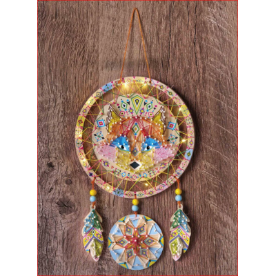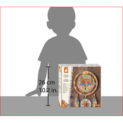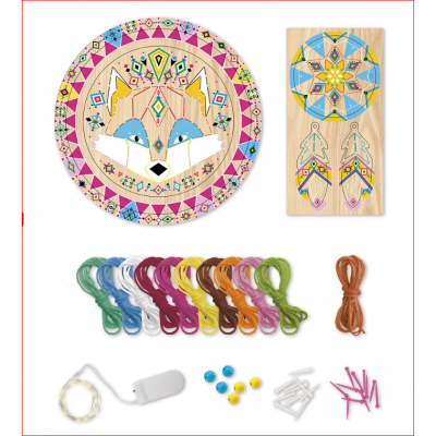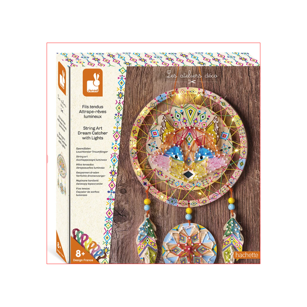 Pas de cauchemars avec ce beau renard ! Avec ce kit créatif, les enfants réalisent un bel attrape-rêves lumineux grâce à la technique des fils tendus, dès 8 ans. En plus d’être une jolie décoration pour leur chambre, l’attrape-rêves renard rassurera les enfants, pour des nuits sans mauvais rêves ! Son petit plus ? Il est lumineux, grâce à la guirlande LED incluse ! Encore un bon point pour se rassurer dans la nuit. Ce loisir créatif met à l’honneur les fils tendus (ou « string art »), dans un style naturel. L’activité permet de développer la créativité et la patience des enfants, pour obtenir une belle réalisation à exposer avec fierté ! Ce coffret créatif déco contient : 2 tableaux avec des formes en mousse prédécoupées, 300 clous en plastique, 10 échevettes de fil en coton de 10 couleurs différentes (7 mètres), 1 corde de jute (3 mètres), 6 perles, et 1 guirlande lumineuse avec piles incluses. Un livret avec le modèle et les instructions est aussi inclus, pour guider les petits dans l’activité pas à pas. Il faudra compter environ 2 heures pour réaliser cet attrape-rêves en fils tendus. Offrez dès maintenant ce coffret à un petit amoureux de la nature, un fan de déco ou un petit artiste en herbe !