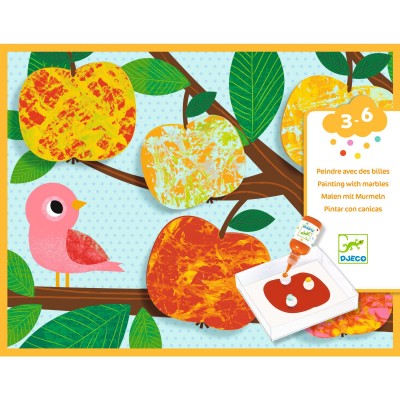 Contenu : 4 tableaux illustrés à compléter, 21 formes à peindre, 4 bouteilles de peinture à doigts (orange, jaune, vert d'eau et vert pomme), 1 boîte en plastique contenant 3 billes en verre, adhésif double-face et 1 livret explicatif pas à pas.