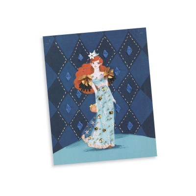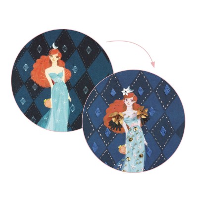 Ce coffret propose une initiation à la broderie séduisante : l'enfant ajoute fils, perles et sequins pour compléter cette élégante robe de soirée.