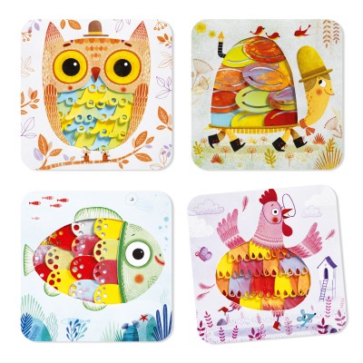 Une activité de peinture sur le thème des animaux. L'enfant applique la peinture sur les planches et peint librement à l'aide des 3 pinceaux. Lorsque la peinture est sèche sec, il détache toutes les pièces des planches puis les colle sur chaque pochette "animal". Il referme la pochette et le corps des animaux se révèle en volume !