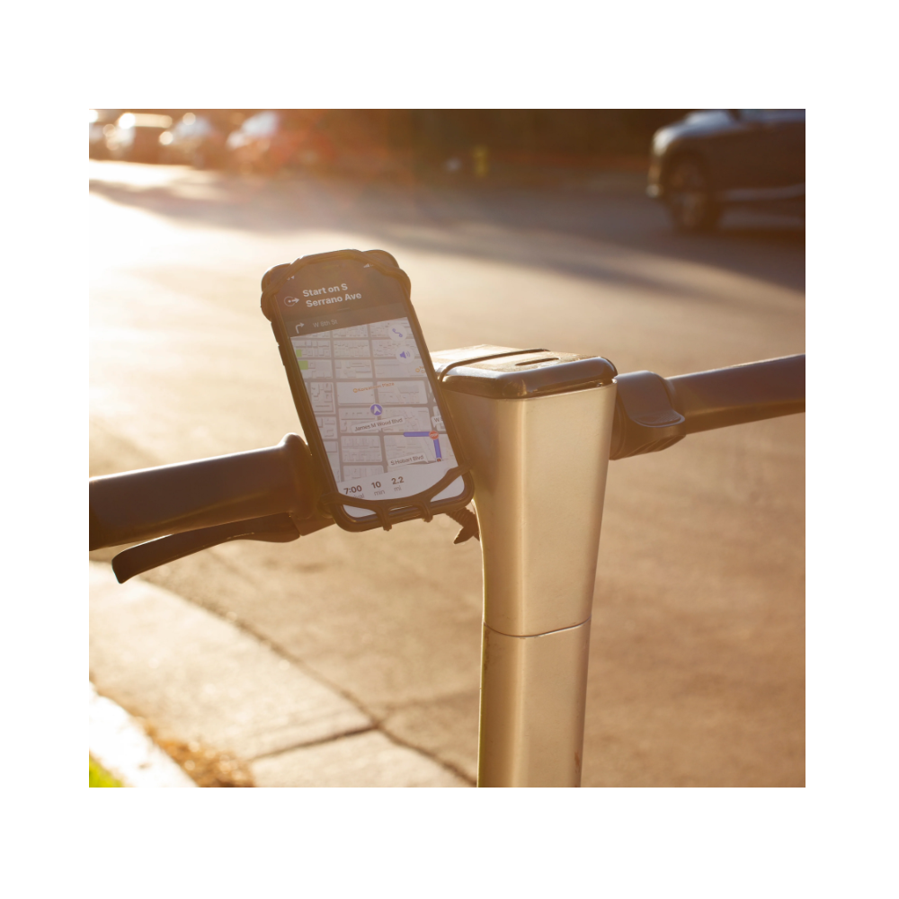 Gardez votre téléphone en sécurité et à portée de main lorsque vous faites du vélo ! Ce support de vélo léger s'étire pour s'adapter à la plupart des tailles de téléphones intelligents. Silicone et résistant aux rebonds, vous pouvez garder les yeux sur votre téléphone et sur la route. Idéal également pour les scooters et les vélos électriques !