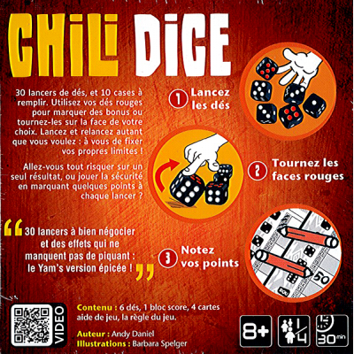 30 lancers de dés et 10 cases à remplir. Utilisez vos dés rouges pour marquer des bonus ou tournez-les sur la face de votre choix. Lancez et relancez autant que vous voulez : à vous de fixer vos propres limites !