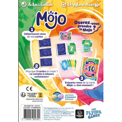 Pour remporter la victoire dans ce jeu captivant, il vous faudra viser le score le plus bas possible à la fin de la partie. Pour y parvenir, vous devrez faire des choix délicats : débarrassez-vous de vos grosses cartes ou privilégiez les petites. Optez pour la séparation de vos cartes ou préférez garder celles de même couleur. Mais attention, si vous avez la carte Mojo en main, soyez prudent, car vos décisions peuvent avoir des conséquences inattendues !Mojo est bien plus qu'un simple jeu de cartes, c'est une véritable expérience d'ambiance. Plus vous êtes nombreux, plus l'interaction est intense, créant ainsi des moments mémorables entre amis ou en famille. Vous prendrez plaisir à explorer différentes stratégies à chaque partie. Selon vos adversaires et les cartes que vous avez en main, les possibilités sont vastes, ce qui rend le jeu dynamique et offre une expérience unique à chaque session de jeu