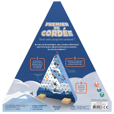 Au cœur de la montagne, deux cordées de 5 grimpeurs s'affrontent pour être la plus rapide à atteindre le sommet. Quel joueur sera le plus stratégique pour parvenir à hisser en premier sa cordée en haut de la montagne ? Contenu : 1 plateau en bois de 30 cm de haut et 2 cordées