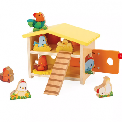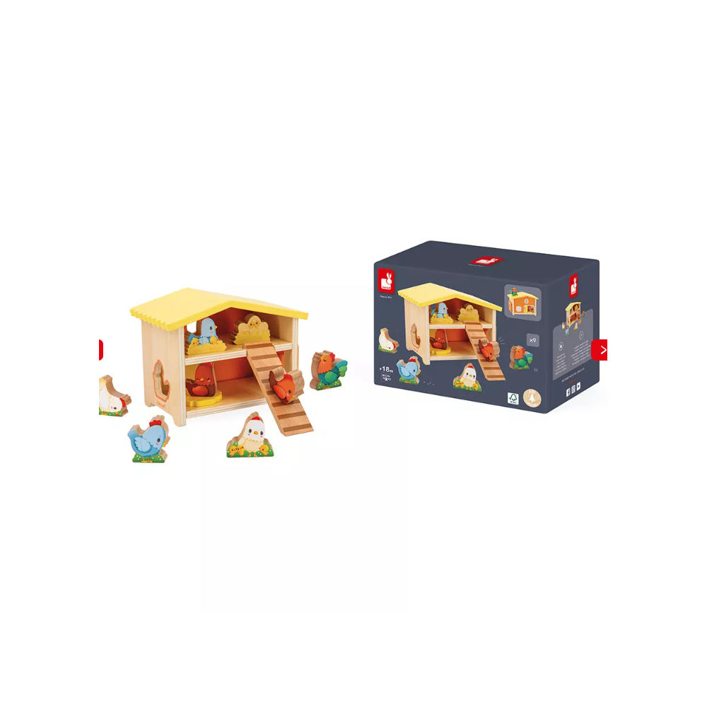 On entend au loin le chant du coq ! Le jour se lève à la ferme et bébé va pouvoir profiter de son poulailler en bois pour donner le ton de cette journée, dès 18 mois. En forme de maisonnette, ce jouet d’éveil invite votre enfant au cœur de la basse-cour grâce aux 9 accessoires inclus. Ce poulailler jouet est idéal pour stimuler l’imagination, mais aussi la motricité fine, car il est plein de surprises ! En effet, les animaux peuvent entrer de différentes façons, à la manière d’une boîte à formes : par une porte coulissante située à l’arrière du poulailler, par une porte avec charnière à élastique sur le côté, par un trou en forme de poule ou encore par une échelle amovible ! Quelque chose nous dit qu’il y aura de l’animation chez nos amies les poules … La basse-cour se compose de 6 poules, 1 coq, 1 nid avec des œufs à couver, 1 nid avec un poussin. Avec ce jouet premier âge, de folles aventures à la ferme attendent bébé ! Encouragez-le à trouver les poussins, à poser les figurines en bois dans un endroit précis du poulailler ou encore à décrire ce que fait chaque poule, pour toujours plus d’apprentissages et de bons moments de partage. Ce jouet pour bébé est composé de bois certifié FSC™.
