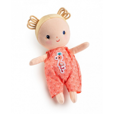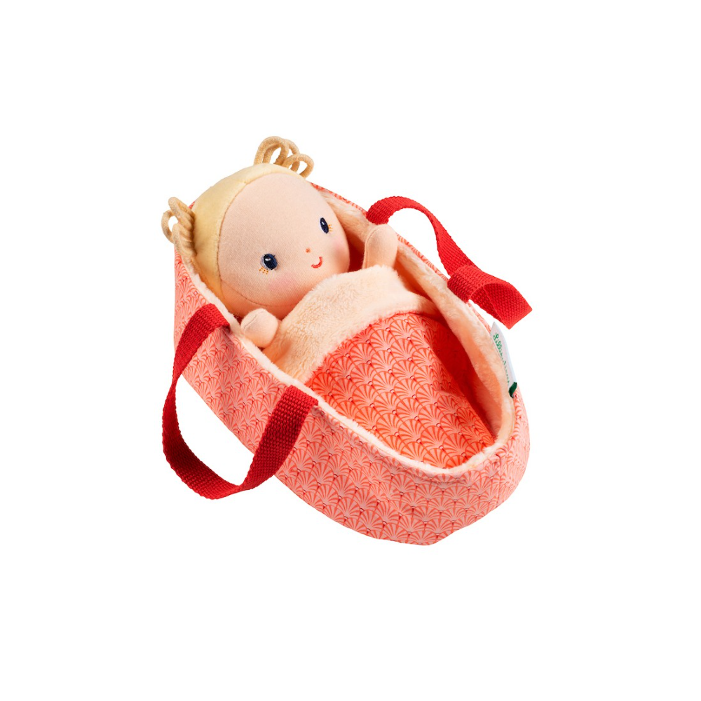 Votre bébé prend soin de son bébé ! Avec ce poupon en tissu de 22 cm, votre enfant dorlote, pouponne et prend soin de bébé Anaïs, dès l'âge de 12 mois. Avec ses 4 accessoires, c'est la poupée en tissu idéale pour imiter les grands. On adore ses bouclettes blondes et son air amical. Pour jouer les apprentis parents, votre enfant dispose d'un joli couffin confortable, mais surtout réversible ! On change de style à sa guise, puis on installe sa poupée pour un gros dodo. Et pour les mini-parents qui ont la bougeotte, on se sert des poignées sur le côté pour se promener pendant que bébé dort paisiblement. Ou pourquoi pas l'emmener en bord de mer ? Pour border leur petite poupée, une jolie couverture est incluse. Elle propose une face duveteuse, et une face décorée de motifs roses. Jouer à la poupée permet aux petits bouts de développer leur imagination, leur capacité d'empathie et leurs compétences sociales. Ils reproduisent avec joie les gestes du quotidien, quand vous prenez soin d'eux ou de leur petit frère/petite sœur. Pour leur permettre également de développer leur motricité fine et pour toujours plus de réalisme, les vêtements d'Anaïs (pyjama et couche) peuvent être retirés et remis encore et encore. Avez-vous reconnu Anaïs le flamand rose à l'avent de la tenue de Bébé Anaïs ? La jolie bouille et les accessoires adaptés aux bambins font de ce petit poupon un premier ami de choix pour commencer à jouer à la poupée. Vous pouvez laver ce poupon en tissu Lilliputiens et ses accessoires en machine à 30°, dans un filet ou taie d'oreiller pour préserver sa douceur au maximum.