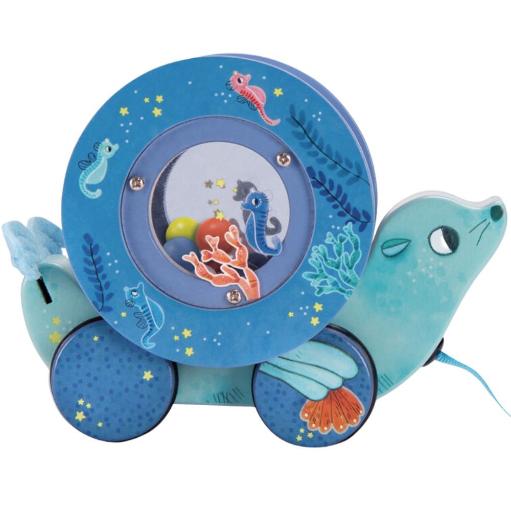Otarie à tirer en bois qui accompagnera bébé dans son éveil aux sons et au toucher. Très joueuse, Émilie fait rouler une drôle de boite sur son dos où se cache des perles colorées. Il suffit de tirer sur le ruban pour les voir bouger