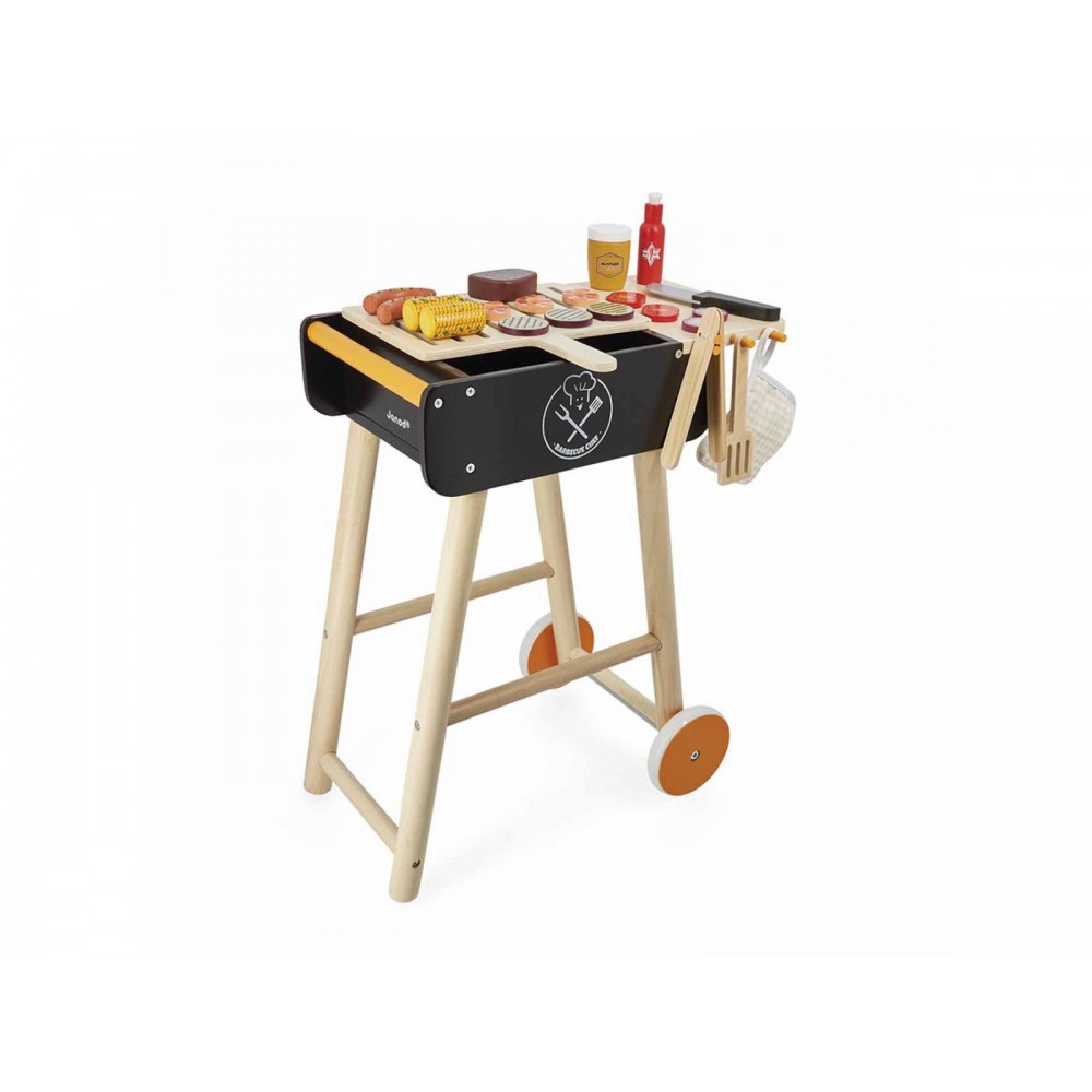 Sentez-vous la bonne odeur de saucisses grillées ? Les repas s'annoncent festifs avec ce magnifique jouet barbecue en bois, plus vrai que nature ! Les enfants, à vos tabliers, le chef c'est vous ! Rendez-vous incontournables de nos étés, les soirées grillades vont maintenant pouvoir se tenir toute l'année et seront orchestrées par nos petits cuistots, qui seront ravis de prendre la place de leurs parents à la cuisson. Grâce à ce Barbecue mobile sur pieds, les enfants à partir de 3 ans pourront s'amuser à cuisiner pour leurs copains. Au menu, de nombreux accessoires pour développer l'imagination culinaire : 57 en tout ! 35 ingrédients gourmands (2 saucisses, 1 steak, 4 tranches de tomate, 14 tranches de poivron en feutrine, 4 crevettes, 4 tranches d'aubergine, 4 tranches d'oignon, 1 pot de sauce piquante et 1 pot de moutarde). Bien sûr, les outils indispensables du parfait cuisinier sont aussi de la partie : 2 pics à brochettes, 1 couteau, 1 spatule, 1 pince et 1 manique en tissu pour tout saisir sans se bruler ! Amusant, le charbon est matérialisé par 15 morceaux de feutrine de différentes couleurs. Ce jouet d'imitation sur le thème de la cuisine, tout à fait original se déplace facilement grâce à ses 2 roues silencieuses et est très stable. Son style nature avec du bois et ses tons brun/orangé en font également un jeu très joli et déco. Ce jouet est parfait pour développer la motricité globale et la créativité. Jouet d'imitation cuisine composé de bois certifié FSC™.