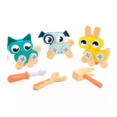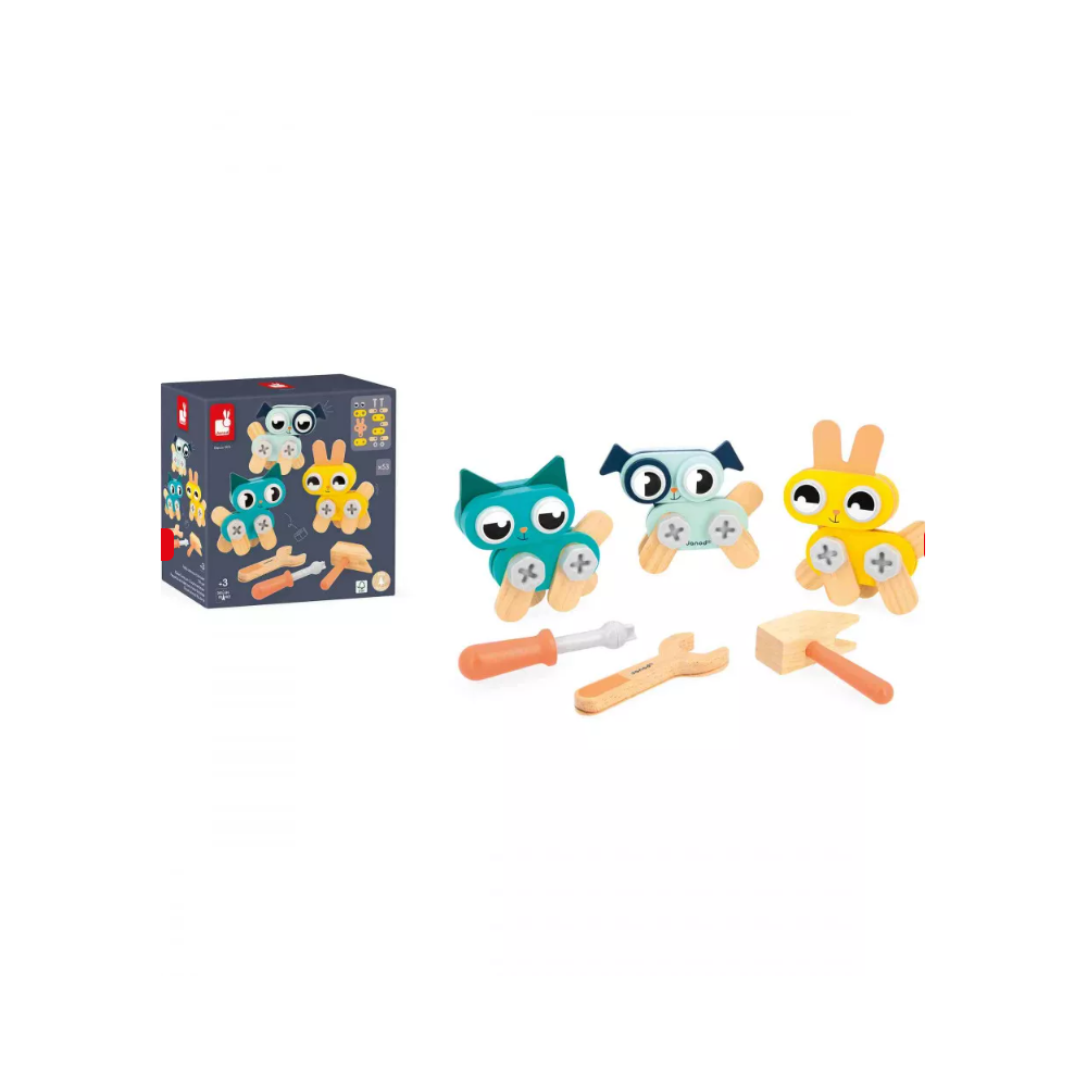 Par ici les apprentis bricoleurs ! Avec ces 3 animaux en bois à construire, les enfants dès 3 ans assemblent leurs petits compagnons pas à pas. Idéal pour développer la motricité fine et l'imagination des bambins, ce jeu de construction va ravir tous les fans de bricolage ! Ils auront tout le nécessaire à leur disposition pour construire un chat, un chien et un lapin : soit 53 pièces et accessoires en tout ! Ce jeu de bricolage se compose de : 3 outils (tournevis, marteau et clé en bois), 32 pièces en bois, 18 éléments en plastique (vis, écrous, inserts). Le chat et le lapin se composent de 16 pièces chacun, le chien de 18 pièces. Pour profiter de leur jeu de construction animaux en toute autonomie, les enfants pourront s'aider des 3 modèles fournis : un par animal ! Qu'ils soient fous de bricolage ou amoureux des animaux, les enfants prendront plaisir à assembler leurs petits compagnons encore et encore. Ils développent leur dextérité et leur logique en assemblant les pièces, et imitent les grands avec entrain en utilisant leurs propres petits outils. Les vis sont équipées de crans pour imiter les vraies, et la visserie plastique est plus facile à manier par les petites mains. Ce set de 3 animaux à construire est composé de bois certifié FSC™, il fait partie de notre collection de jouets d'imitation bricolage : Brico'Kids.