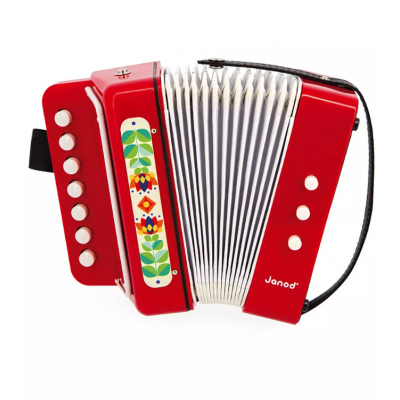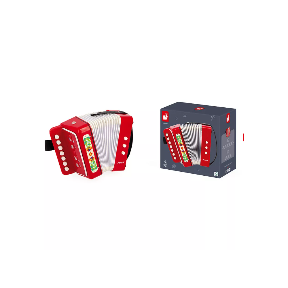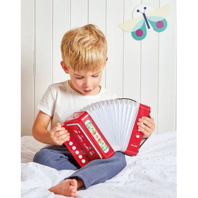 Prêts pour un concert ? Avec cet accordéon pour enfant à partir de 3 ans, les mélodies fusent ! Idéal pour stimuler l'imagination, favoriser l'expérimentation musicale et imiter les plus grands, notre accordéon rouge a tout bon ! Parce que prendre confiance en soi et exprimer sa personnalité passe aussi par l'expression musicale, ce jouet d'imitation va donner le ton à la maison. Cet accordéon à soufflet est équipé de 7 touches sonores, 2 boutons pour changer le ton, 1 bouton pour insuffler de l'air et ainsi l'ouvrir et le fermer plus facilement par l'enfant. Proposer un jouet musical à votre bambin, c'est lui donner l'occasion d'être la star du jour ! C'est aussi le moment pour lui d'expérimenter avec les différents sons, et de voir avec quelle satisfaction il joue ses premières mélodies. Faites entrer la musique dans l'univers de votre enfant avec cet accordéon jouet ! Il fait partie de notre gamme Gioia, une invitation à l’éveil musical dans la joie, permettant aux tout-petits de découvrir le monde des sons de manière ludique et sous le signe du partage.