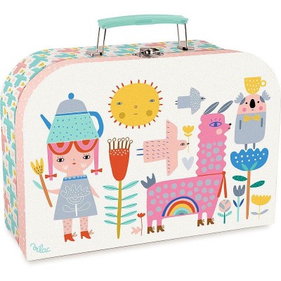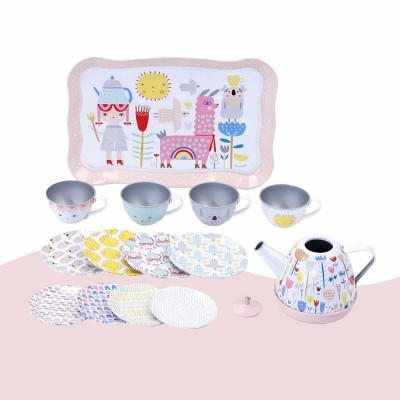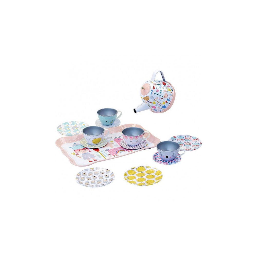 Une jolie dinette musicale de 14 pièces en métal décorée par Suzy Ultman. Quant on penche la théière une douce mélodie "joyeux anniversaire" se met en marche. Composé de : 1 théière musicale, 4 tasses, 4 sous-tasses, 4 assiettes à dessert, 1 plateau. Livré dans sa jolie valisette en carton.
