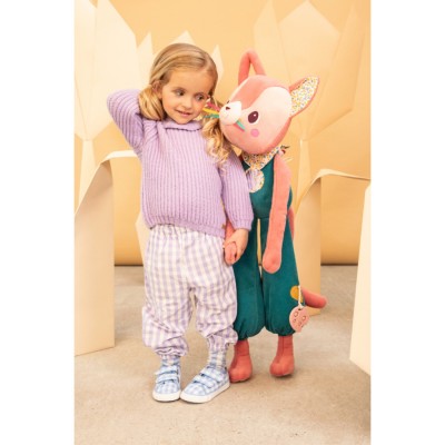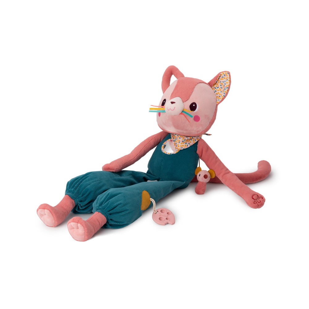 Avec son style décontracté, toujours accompagnée de ses amies les souris, voici Jeanne : la jardinière de la joyeuse bande Lilliputiens. Cette maxi peluche chat de 87 cm propose 5 activités. Vous pouvez la proposer en décoration ou comme compagne de jeu aux plus petits dès l’âge de 6 mois. Notre félin malicieux est doté d’une poignée en guise d’oreille, pour facilement l’emporter partout ! Votre enfant ne se lassera pas de caresser la douce frimousse de Jeanne et s’installera confortablement contre elle pour de gros câlins ! De plus, la grande peluche rose dispose de nombreuses activités d’éveil comme une clochette amusante dans la tête, du papier bruissant dans une oreille, un anneau de dentition en silicone détachable avec activité de popping, ou encore un miroir rond pour s’admirer. Enfin, Jeanne est accompagnée d’une souris en peluche à faire tinter joyeusement. Elle aime quitter la maison pour suivre le chat au jardin, mais rentre toujours à l’heure pour le goûter ! En plus de joliment décorer la chambre de votre bambin et d’être toujours disponible pour les câlins ; cette peluche géante lui permet de développer son acuité visuelle et auditive, et favorise la découverte tactile grâce aux nombreuses activités à explorer. Avec ses détails bucoliques, ses couleurs apaisantes, ses matières riches et agréables, et ses nombreuses activités, la peluche Découvertes Jeanne le chat égayera la déco de chambre de votre enfant, qui ne manquera pas de la câliner. On adore son pantalon baggy, son bandana, ses longues jambes et ses moustaches colorées ! Ce jouet d’activités se lave facilement en machine à 30° après avoir retiré la feuille en silicone. Égayez dès maintenant l’espace jeu de votre petit bout !