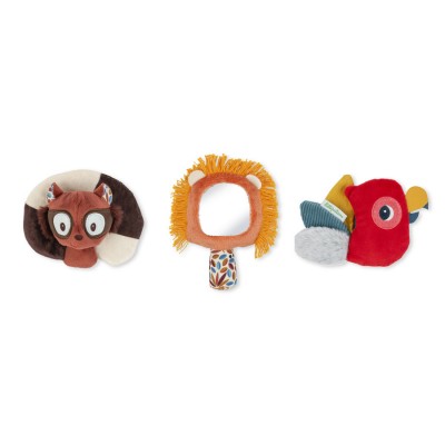 Offrez ces premiers petits jouets Lilliputiens à bébé ! Ce set de 3 hochets en tissu convient dès la naissance : un cadeau idéal, qui saura éveiller les sens et attiser la curiosité des petits. Présentés dans leur joli coffret illustré, ces jouets d’éveil sensoriel stimulent 3 sens : la vue, le toucher et l’ouïe. Pour cela, retrouvez : Elvis le lémurien, qui produit un bruissement amusant ; Jack le lion et sa belle crinière, avec son petit miroir pour s’observer ; et Gilles le perroquet flamboyant, qui propose plusieurs textures à découvrir du bout des doigts. Ce trio doux et coloré se pare aussi de motifs originaux. Ce sont les premiers compagnons de bébé ! Avec ces hochets animaux en peluche, il apprend à être curieux et s’éveille au monde à son rythme. Leur forme a été pensée pour une prise en main facile par les plus petits. Voilà une belle idée cadeau pour un bout de chou, dans une boîte à l’image de notre joyeuse bande Lilliputiens, pour faire craquer toute la famille ! Bienvenue bébé, bienvenue Jack et les copains !