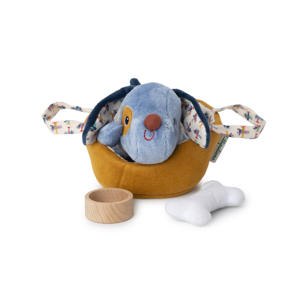 Quel charmant petit chiot dans son panier ! Jules le chien en peluche et ses accessoires feront craquer petits et grands, dès 12 mois. Pour s'amuser et prendre soin de son premier petit chien, votre enfant a tout le nécessaire : un panier réversible avec une face jaune et une face à motifs, un os en tissu, une gamelle en bois avec un imprimé os au fond et une veste amovible. Soit 4 accessoires pour nourrir son chien en peluche, le faire jouer ou dormir tranquillement dans son panier. Avec ses poignées, on peut transporter Jules et ses petites affaires partout où on le souhaite ! En prenant bien soin de lui ou en lui touchant la truffe, il répondra à ses attentions par de joyeux aboiements. Une véritable peluche sonore douce, originale et charmante ! Les petits avions imprimés sur le panier sont assortis à ceux dans les oreilles de Jules. C'est un chien aviateur qui adore l'aventure ! Ses longues oreilles toutes douces sont une extension de plus à cajoler sur cette peluche Lilliputiens. Jules adore enfiler sa veste pour voler dans son avion, mordiller son os préféré et faire la sieste après un bon repas. Avec lui, votre tout-petit développe son imagination et son sens de l'empathie. Doux et joyeux, Jules sera un ami fidèle pour votre enfant. La peluche bleue et ses accessoires sont lavables en machine à 30°, à l'exception des parties en bois. Un copain qui a du chien !