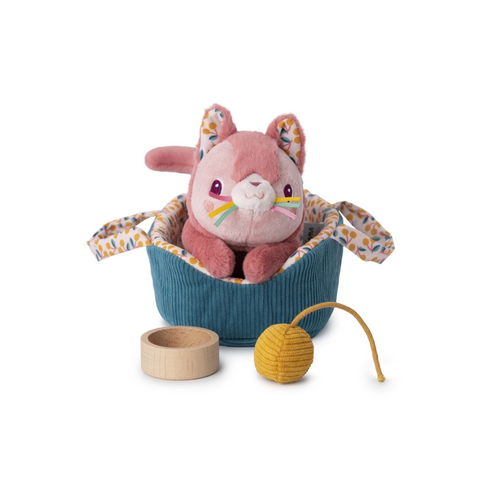 Quel adorable petit chaton dans son panier ! Jeanne le chat en peluche et ses accessoires feront craquer petits et grands, dès 12 mois. Pour s'amuser et prendre soin de son premier petit chat, votre enfant a tout le nécessaire : un panier réversible avec une face rainurée et une face à motifs, une pelote de laine jaune, une gamelle en bois avec un imprimé poissons au fond et un gilet amovible. Soit 4 accessoires pour nourrir son chat en peluche, le faire jouer ou dormir paisiblement dans son panier. Avec ses poignées, on peut transporter Jeanne et ses petites affaires partout où on le souhaite ! En prenant bien soin d'elle ou en lui touchant la truffe, elle répondra à ses attentions par de doux miaulements. Une véritable peluche sonore douce, originale et adorable ! Les motifs jaunes en forme de cerises imprimés sur le panier sont assortis à ceux dans les oreilles de Jeanne. Ils rappellent les fruits qui poussent dans le jardin où elle adore s'amuser ! Ses petites moustaches rubans sont une extension de plus à parcourir en cajolant cette peluche Lilliputiens. Jeanne adore enfiler son gilet pour jouer dehors, faire rouler sa pelote préférée et faire la sieste après un bon repas. Avec elle, votre tout-petit développe son imagination et son sens de l'empathie. Douce et amicale, Jeanne sera une amie fidèle pour votre enfant. La peluche rose et ses accessoires sont lavables en machine à 30°, à l'exception des parties en bois. Ecoutez ce doux ronron …