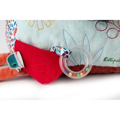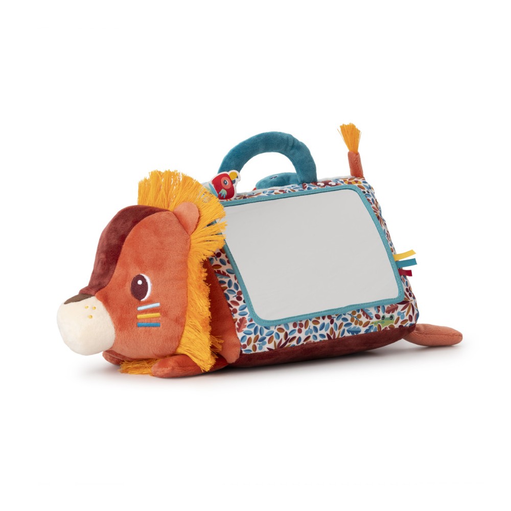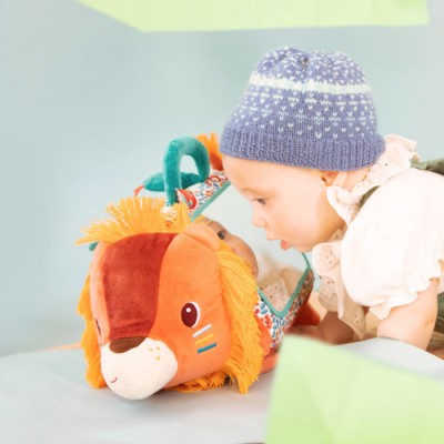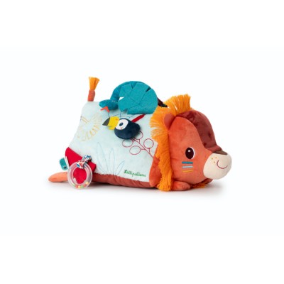 Bébé se met sur le ventre ? Jack le lion aussi ! Pour amuser et éveiller les plus petits, dès 3 mois, notre lion câlin se présente sous forme de triangle d'activités en tissu avec un grand miroir ! Au programme : 6 activités disponibles de part et d'autre de la peluche, pour de longues heures de jeu et d'éveil sensoriel. Et si on commençait par pincer le nez de Jack pour faire "pouet" ? Ensuite, faites tinter la clochette sur son dos ou soulevez une grande feuille pour découvrir un hochet toucan : coucou Pablo ! Puis découvrez un hochet à billes très intéressant à observer et à agiter. Enfin, pour toujours plus développer l'acuité visuelle de bébé, place à la star de ce jouet multiactivités : le miroir ! On se découvre, on s'observe, on se reconnait, on bouge ... C'est si captivant de découvrir son reflet ! Et parce que la jungle, où vit notre ami Jack, fourmille de surprises, nous avons ajouté une foule d'éléments tactiles à découvrir du bout des doigts. Des rubans, des étiquettes et des broderies qu'on ne se lasse pas de toucher, même avec les pieds ! Quant aux motifs inspirés de la jungle, ils sont riches et contrastés pour toujours plaire à bébé. Faites des temps de jeu de votre tout-petit une véritable invitation à l'exploration avec cette peluche d'activités douce et colorée. Son petit plus ? La poignée en forme de serpent sur le dessus, pour facilement l'emporter partout. Jack est un personnage festif et attachant dans la famille Lilliputiens. Avec lui, chaque jour est une fête ! Ce triangle multiactivités en tissu mesure 34x17x17 cm, il est lavable en surface uniquement.